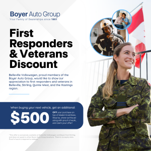 At Belleville Volkswagen, proud members of the Boyer Auto Group, we deeply value the service and sacrifice of our local heroes. That’s why we’re offering a special First Responders and Veterans Discount to show our appreciation. Eligible first responders and veterans in Belleville, Stirling, Quinte West, and the Hastings region can receive an additional $500 OFF their next vehicle purchase, on top of current dealer incentives. Whether you’re in the market for a new or used vehicle, this exclusive offer is our way of saying thank you for your dedication and service!